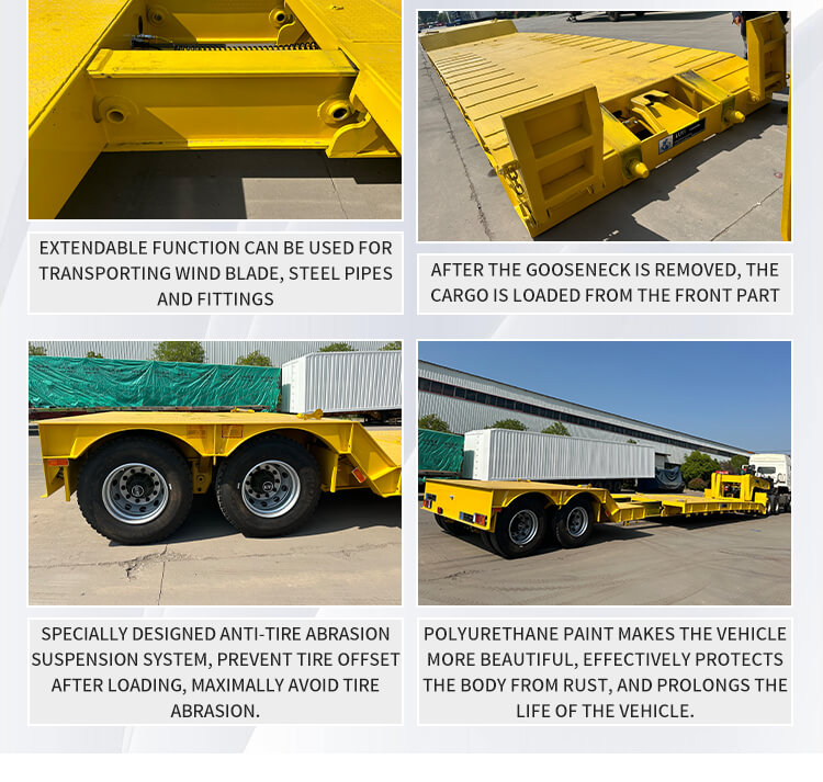 BPW, Fuwa, या CIMC जैसे ब्रांडों के 13-टन एक्सल से सुसज्जित, यह वैकल्पिक मैकेनिकल स्प्रिंग या एयर सस्पेंशन सिस्टम प्रदान करता है, जो मजबूत ड्राइविंग स्थिरता और 120 टन के अधिकतम प्रभावी पेलोड के लिए 12R22.5 टायर के साथ जोड़ा गया है। इसे JOST, Fuwa, या Yahua से 28-टन लैंडिंग लेग्स और वैकल्पिक 90# या 50# किंगपिन के साथ कॉन्फ़िगर किया गया है, जो स्थिर कनेक्शन और उच्च अनुकूलनशीलता सुनिश्चित करता है। अनुकूलन योग्य रंगों के साथ, यह अपने वियोज्य गूज़नेक डिज़ाइन और मजबूत भार-वहन प्रदर्शन के कारण भारी माल परिवहन के लिए एक विश्वसनीय विकल्प बन जाता है।
