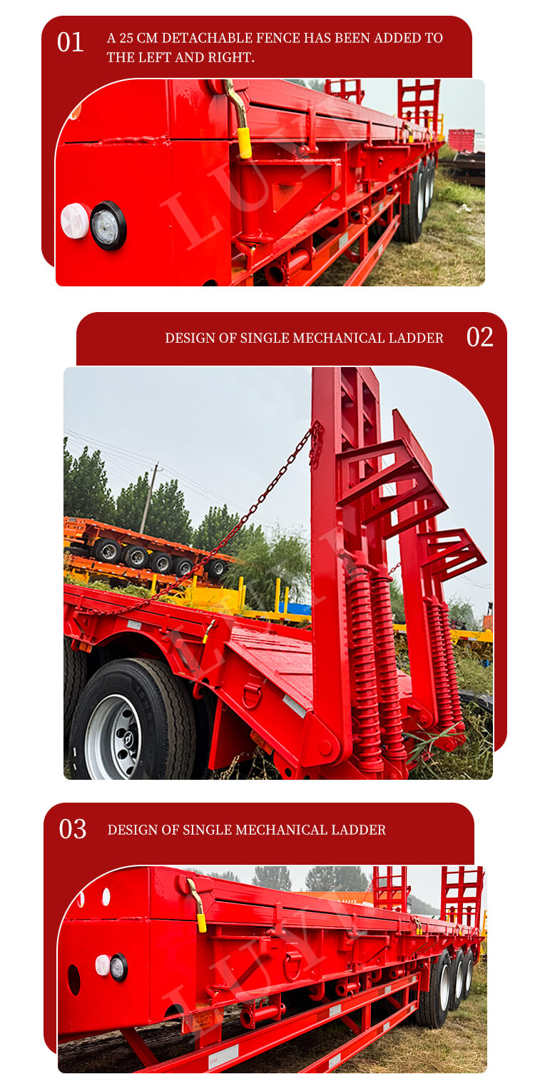 प्रीमियम 13T/16T एक्सल (LUYI, BPW, या FUWA से वैकल्पिक) से सुसज्जित और मैकेनिकल या एयर सस्पेंशन सिस्टम के साथ जोड़ा गया, ट्रेलर स्थिर और विश्वसनीय संचालन सुनिश्चित करता है। 10-लेयर लीफ स्प्रिंग (चौड़ाई में 90 मिमी और मोटाई में 13 मिमी) डुअल-लाइन ब्रेकिंग सिस्टम के साथ मिलकर सटीक और कुशल ब्रेकिंग प्रदर्शन की गारंटी देता है। यह 28-टन लैंडिंग गियर और 2"(50 मिमी) या 3.5" (90 मिमी) जोस्ट किंग पिन के साथ मानक आता है, जो विभिन्न ट्रैक्टर इकाइयों के साथ संगत है। अनुकूलन योग्य रंगों के साथ, यह ट्रेलर सभी प्रकार के भारी माल की परिवहन आवश्यकताओं को पूरी तरह से पूरा करता है, जो इसे रसद और परिवहन उद्योग में एक आदर्श विकल्प बनाता है।
