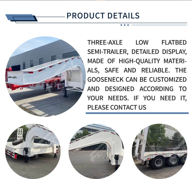 उच्च गुणवत्ता वाले स्टील से निर्मित, इसका आकार 17000×3000×1500 मिमी है, जो कार्गो के लिए पर्याप्त जगह सुनिश्चित करता है। इसमें स्थिर ड्राइविंग और प्रभावी कार्गो सुरक्षा की गारंटी के लिए वैकल्पिक एयर या लीफ स्प्रिंग सस्पेंशन के साथ मजबूत लोड-बेयरिंग के लिए 4 एक्सल हैं। वियोज्य गूज़नेक डिज़ाइन लोडिंग लचीलेपन को बढ़ाता है, जबकि हाइड्रोलिक या मैनुअल सीढ़ी विकल्प भारी उपकरण लोडिंग और अनलोडिंग को सरल बनाते हैं।