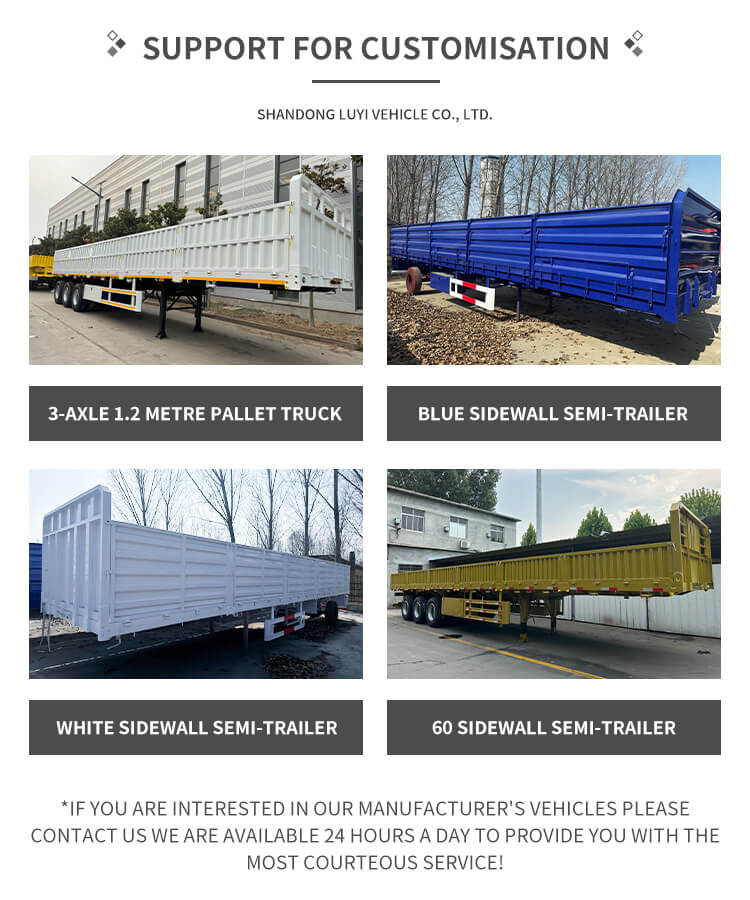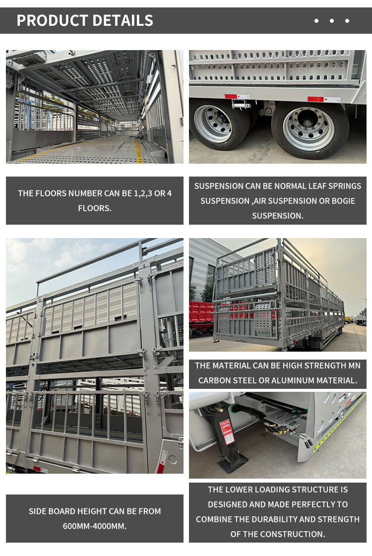 एल्यूमीनियम/मिश्र धातु सामग्री से निर्मित, ट्रेलर हल्का लेकिन टिकाऊ है, भारी भार की जरूरतों को आसानी से पूरा करने के लिए 30,000 किलोग्राम से अधिक का अधिकतम प्रभावी पेलोड है। एक्सल के लिए, आप 13/16-टन FUWA, BPW और CIMC जैसे उच्च गुणवत्ता वाले ब्रांड चुन सकते हैं। यह 11.00r20, 12r22.5, 315 और 385 जैसे विभिन्न विशिष्टताओं में टायरों से मेल खाता है, जबकि निलंबन प्रणाली दो विकल्प प्रदान करती है: यांत्रिक निलंबन और वायु निलंबन, जो विभिन्न सड़क स्थितियों के लिए स्थिर ड्राइविंग सुनिश्चित करता है। रंग को ग्राहकों की आवश्यकताओं के अनुसार अनुकूलित किया जा सकता है, और यह 1 साल की बिक्री-पश्चात सेवा के साथ आता है, जो परिवहन परिदृश्यों और व्यक्तिगत आवश्यकताओं को पूरी तरह से पूरा करता है, जिससे यह पशुधन और थोक कार्गो परिवहन के लिए एक आदर्श विकल्प बन जाता है।