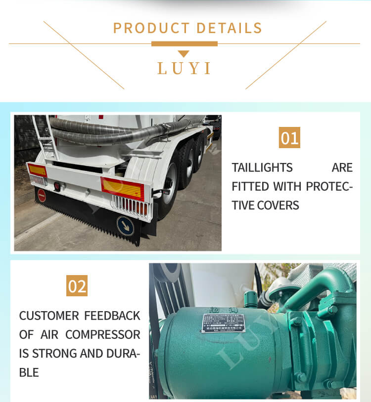 LUYI 3-एक्सल 30-60 क्यूबिक मीटर सीमेंट टैंकर, जिसे पाउडर टैंक ट्रक के रूप में भी जाना जाता है, चीन के शेडोंग प्रांत से आता है। यह एक उच्च दक्षता वाला अर्ध-ट्रेलर है जिसे विशेष रूप से थोक सीमेंट पाउडर के परिवहन के लिए डिज़ाइन किया गया है, जो कार्गो परिवहन परिदृश्यों की जरूरतों को सटीक रूप से पूरा करता है।