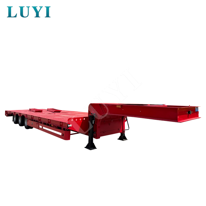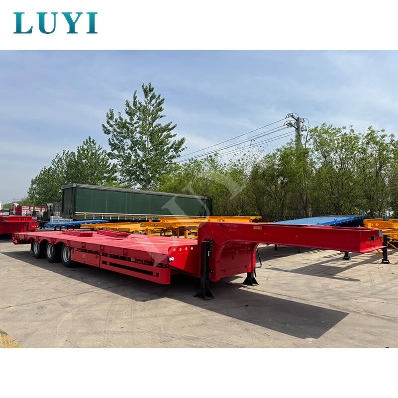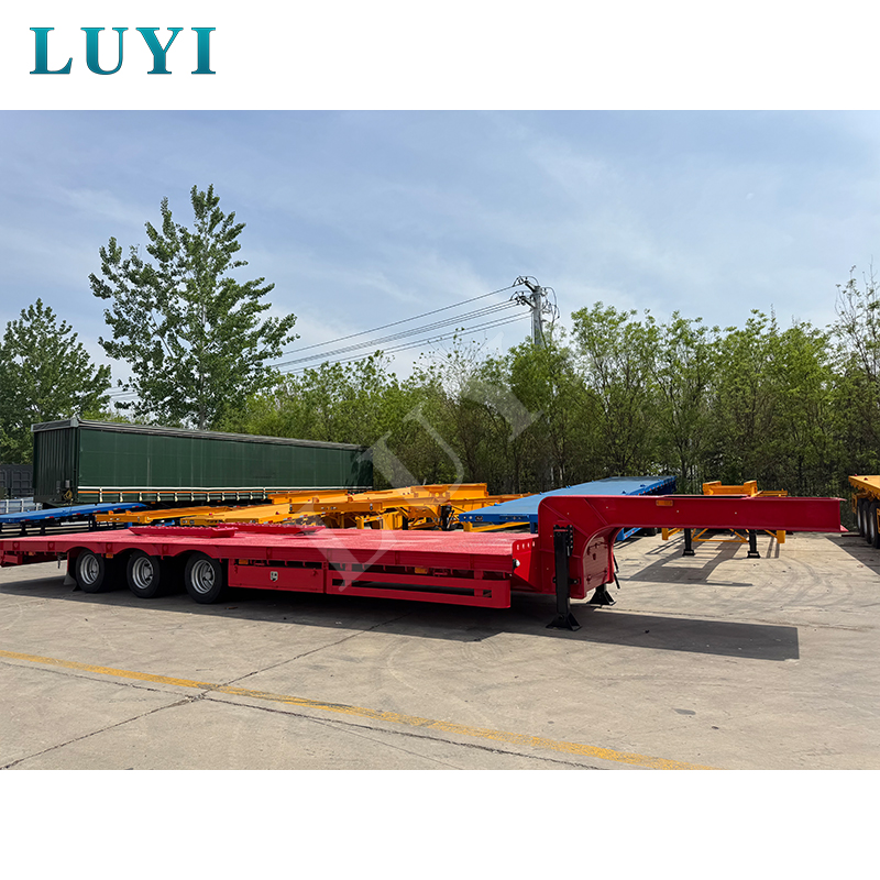 LUYI 3-एक्सल 80-टन लो-चेसिस फ्लैटबेड सेमी-ट्रेलर, शेडोंग, चीन से एक बिल्कुल नया हेवी-ड्यूटी परिवहन वाहन, भारी उपकरण परिवहन परिदृश्यों के लिए तैयार किया गया है।