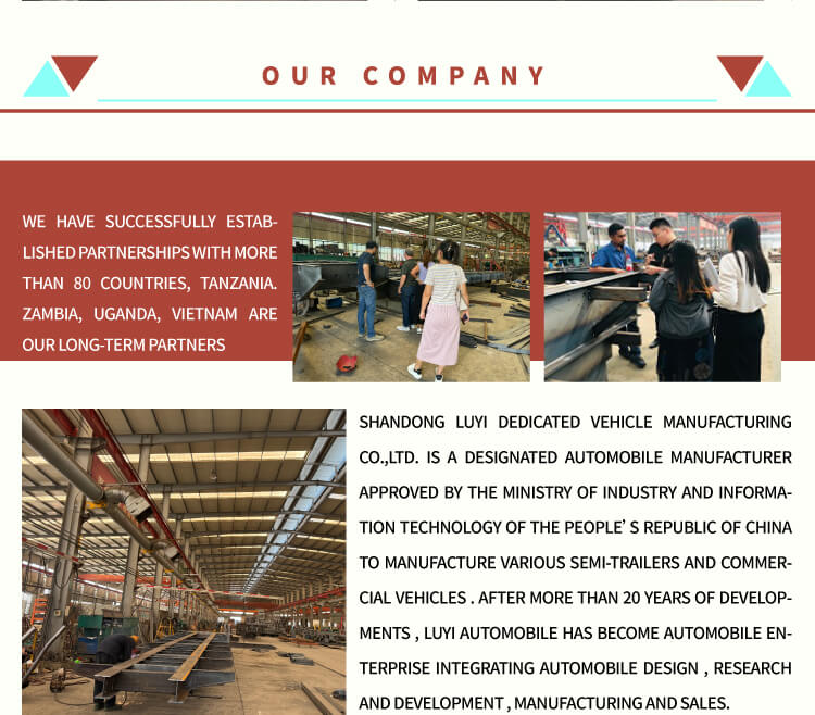 उच्च गुणवत्ता वाले स्टील से बने, ट्रक का माप 1100025002000 मिमी है और इसका अधिकतम पेलोड 80T तक है, जो विभिन्न भारी माल के परिवहन को आसानी से संभालता है। यह JOST ब्रांड लैंडिंग गियर और 2-इंच (50 मिमी) या 3.5-इंच (90 मिमी) JOST किंग पिन से सुसज्जित है, जो उत्कृष्ट स्थिरता और अनुकूलनशीलता सुनिश्चित करता है। विभिन्न सड़क स्थितियों के अनुरूप टायर 11.00r20, 12r22.5, 315 और 385 सहित कई विशिष्टताओं में उपलब्ध हैं। निलंबन प्रणाली दो विकल्प प्रदान करती है: यांत्रिक निलंबन और वायु निलंबन, विभिन्न परिवहन आवश्यकताओं को पूरा करते हुए। इसके अलावा, ट्रक का रंग विशिष्टता दिखाने के लिए ग्राहक अनुकूलन का समर्थन करता है।