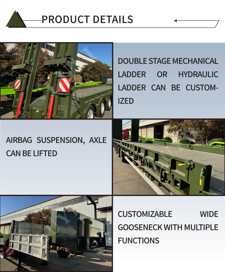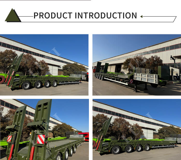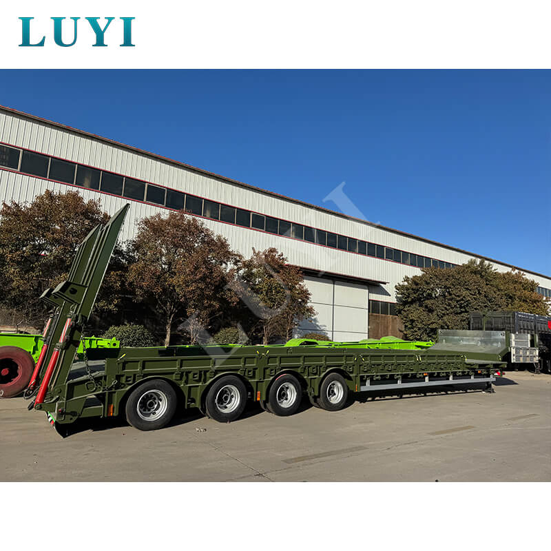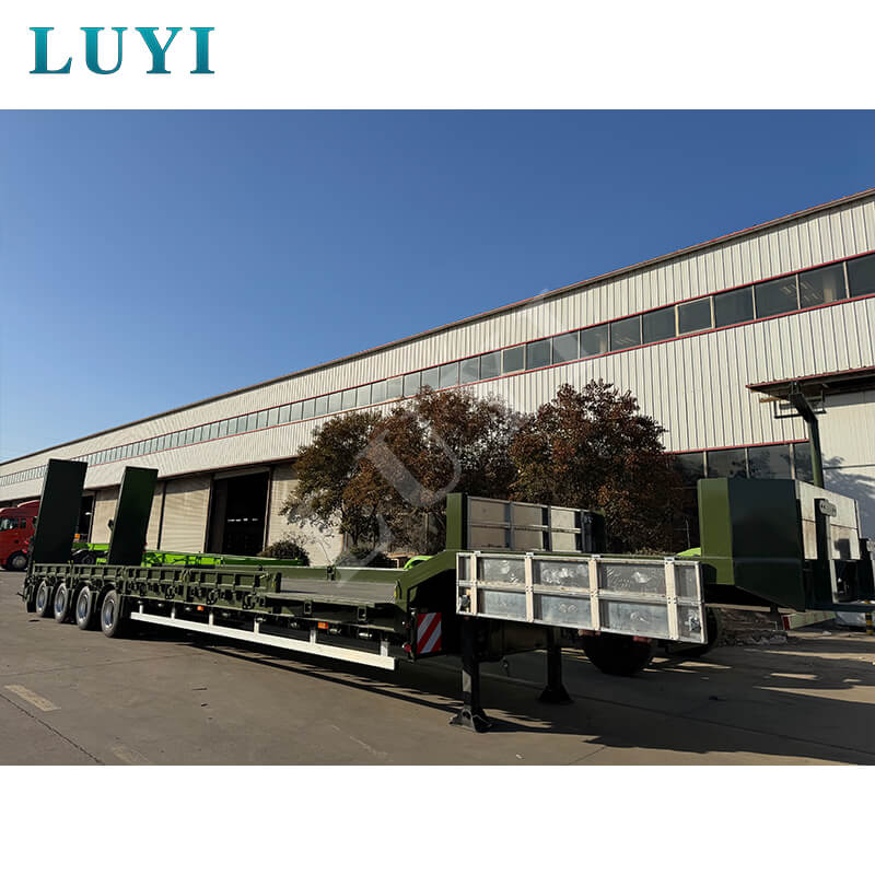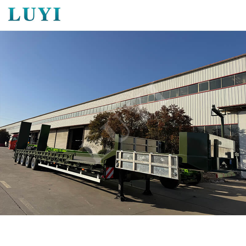 LUYI 4-एक्सल 60-टन गूज़नेक लो-बेड सेमी-ट्रेलर, शेडोंग, चीन का एक बिल्कुल नया उत्पाद, एक पेशेवर ट्रक ट्रेलर है जिसे भारी कार्गो परिवहन के लिए डिज़ाइन किया गया है। यह मुख्य सामग्री के रूप में उच्च गुणवत्ता वाले स्टील को अपनाता है, जिसका मानक आकार 13m×3m×2.5m है, और भारी-भरकम परिवहन आवश्यकताओं को पूरा करने के लिए 60 टन का अधिकतम पेलोड है।