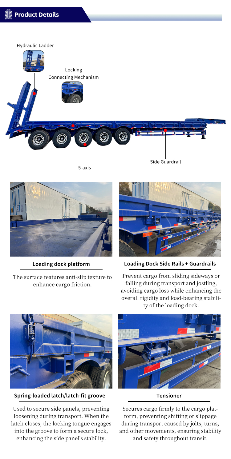 प्रीमियम घटकों से सुसज्जित, इसमें एयर सस्पेंशन सिस्टम के साथ फूवा/बीपीडब्ल्यू 13-टन एक्सल की सुविधा है, जो असाधारण ड्राइविंग स्थिरता और शॉक अवशोषण सुनिश्चित करता है। जोस्ट 28-टन दो-स्पीड लैंडिंग गियर कुशल उठाने और कम करने के संचालन को सक्षम बनाता है। ग्राहक विविध सड़क स्थितियों के अनुरूप 315/80R22.5, 12R22.5 और 11.00R20 सहित टायर विकल्पों में से चुन सकते हैं। 24V एलईडी प्रकाश प्रणाली कम ऊर्जा खपत के साथ उज्ज्वल रोशनी प्रदान करती है, और शरीर का रंग व्यक्तिगत आवश्यकताओं को पूरा करने के लिए अनुकूलन योग्य है। लुयी की विश्वसनीय गुणवत्ता द्वारा समर्थित, यह सेमी-ट्रेलर वैश्विक ग्राहकों के लिए एक विश्वसनीय हेवी-हॉल समाधान प्रदान करता है।