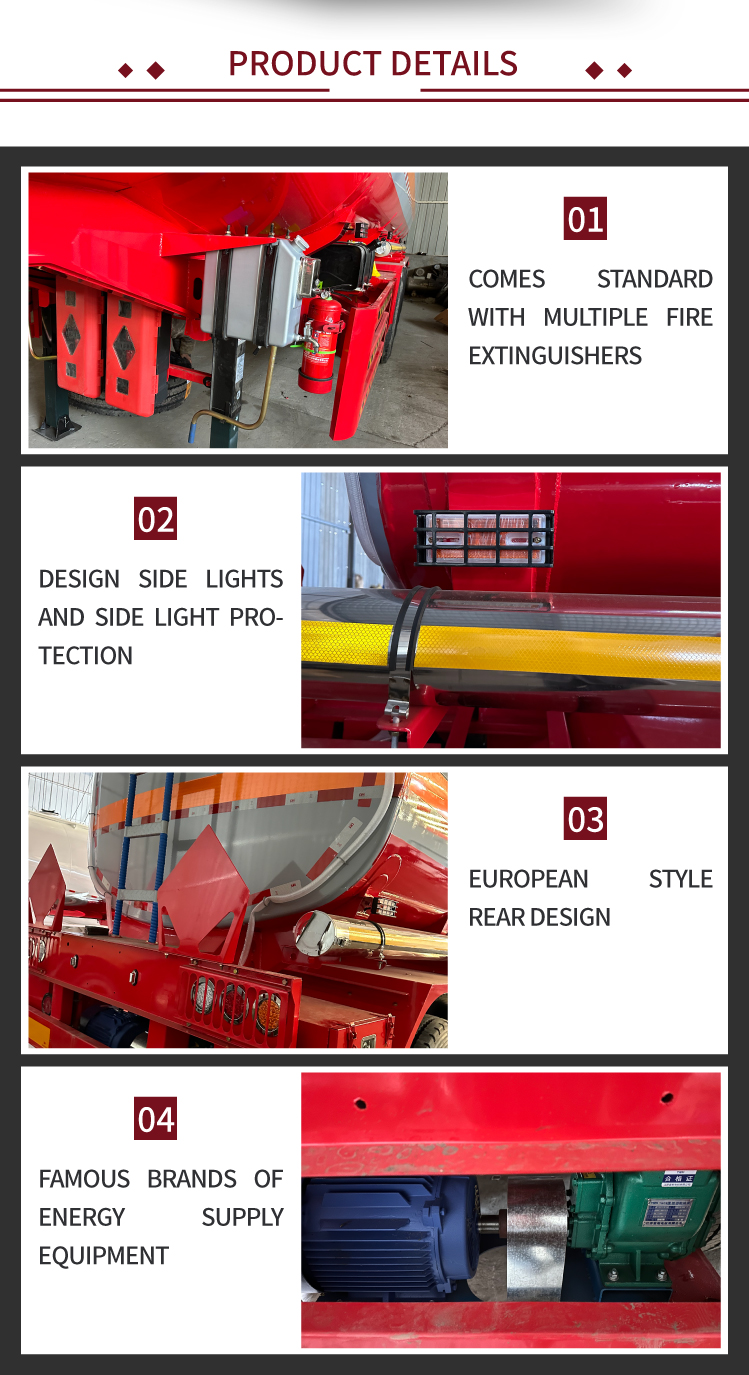 व्यापक अनुकूलन की पेशकश करते हुए, यह संरचनात्मक समायोजन (मल्टी-कम्पार्टमेंट डिजाइन, समायोज्य तेल इनलेट/आउटलेट), सामग्री उन्नयन (क्यू235 कार्बन स्टील, संक्षारण प्रतिरोध के लिए स्टेनलेस स्टील, हल्के वजन के लिए एल्यूमीनियम मिश्र धातु), और कार्यात्मक परिवर्धन (वेव बैफल्स, तापमान नियंत्रण, बुद्धिमान स्तर गेज) का समर्थन करता है। सेमी-ट्रेलर के रूप में, यह उच्च लचीलेपन (रखरखाव के लिए अलग पार्किंग) और दबाव सहित राष्ट्रीय नियमों के सख्त अनुपालन के लिए ट्रैक्टरों के साथ जुड़ता है।ई परीक्षण और रिसाव की रोकथाम, सुरक्षित और कुशल तेल परिवहन सुनिश्चित करना।