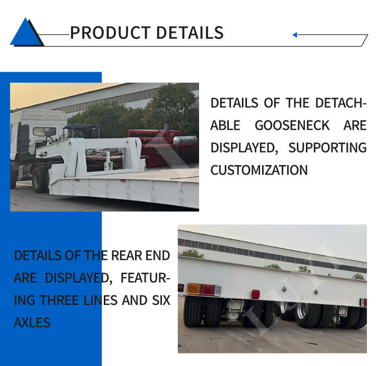 विवरण के संदर्भ में, यह मानक 28-टन लैंडिंग गियर से सुसज्जित है और विभिन्न ट्रैक्टरों के अनुकूल होने के लिए दो विकल्पों में JOST किंग पिन प्रदान करता है: 2" (50 मिमी) या 3.5" (90 मिमी)। शरीर का रंग ग्राहकों द्वारा अनुकूलन योग्य है, और फोल्डिंग गूज़नेक डिज़ाइन परिवहन लचीलेपन को और बढ़ाता है। यह इंजीनियरिंग, खनन और अन्य क्षेत्रों में भारी-भरकम उपकरण स्थानांतरण के लिए एक आदर्श विकल्प है।